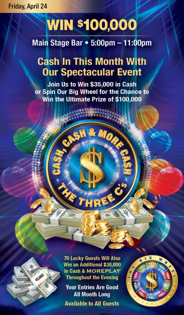 ¡Únete a nosotros en nuestro NUEVO y espectacular sorteo: Las Tres C: ¡Dinero, dinero y más dinero! El viernes 24 de abril, podrías ganar 35.000 dólares en efectivo o girar nuestra Gran Rueda para tener la oportunidad de ganar el premio máximo de 100.000 dólares.